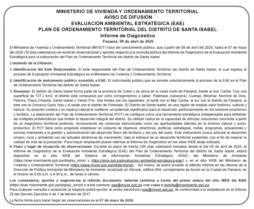 Los comentarios, aportes o sugerencias al referido documento, deberán remitirse a través del primer enlace del sitio WEB del SIAE (https://siae.miambiente.gob.pa/display_sinia/) o a los correos: eae@miviot.gob.pa con copia a rbonilla@miambiente.gob.pa.