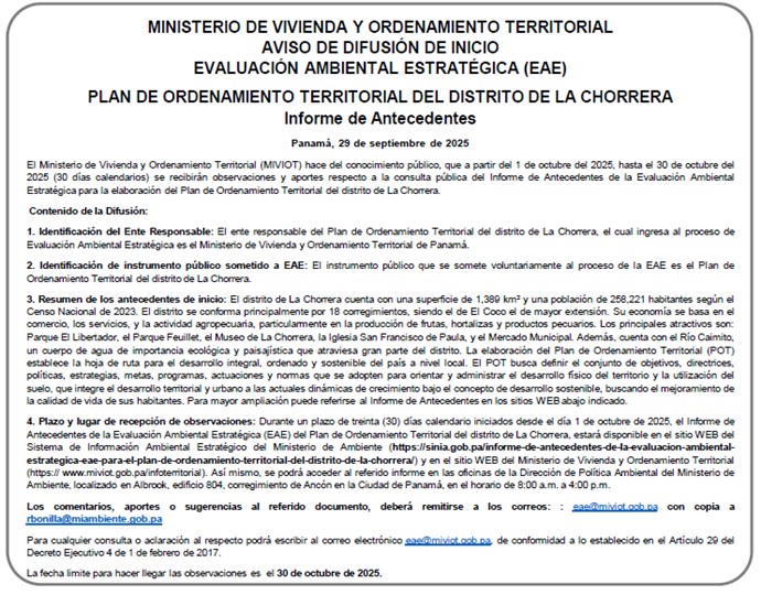 Los comentarios, aportes o sugerencias al referido documento, deberá remitirse a los correos: eae@miviot.gob.pa con copia a rbonilla@miambiente.gob.pa