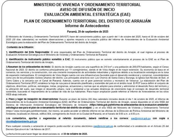 - Informe de Antecedentes de la Evaluación Ambiental Estratégica (EAE) para el Plan de Ordenamiento Territorial del distrito de Arraiján